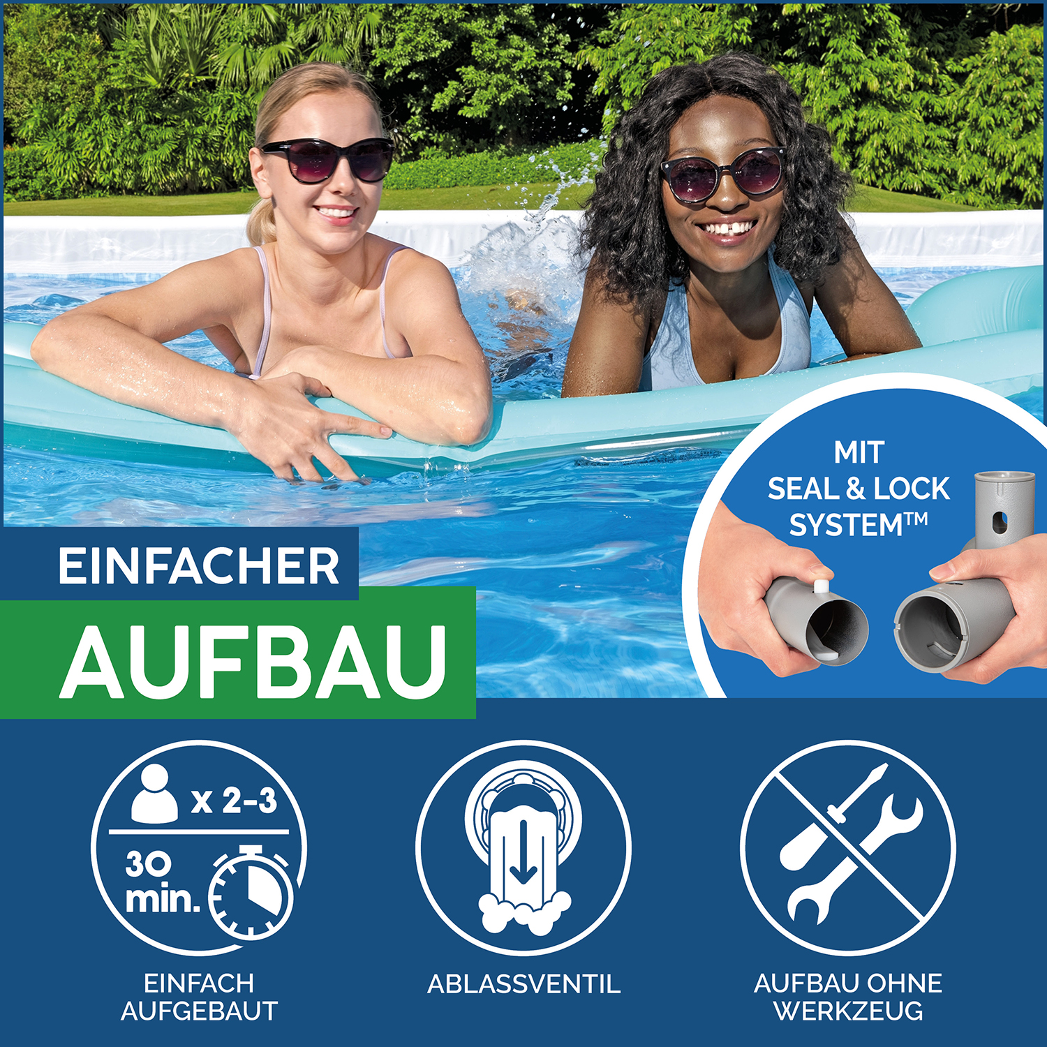 Erleben Sie (und Ihre Kinder) den Sommer Ihrer Träume mit einem eigenen Frame Pool in Ihrem Garten! Der Bestway® Power Steel™ bietet hierfür eine praktische wie langlebige Lösung. Langlebige Konstruktion: Der korrosionsbeständige Stahlrahmen ist mit unserem bewährten Seal & Lock System™ ausgestattet. So wird eine sichere Verbindung der einzelnen Rahmenelemente gewährleistet. Die schützenden Verbindungen verhindern Schäden durch rostverursachenden Metall-auf-Metall-Kontakt. Der robuste Poolfolie besteht aus einem unserem extrem langlebigen, 3-lagigen TriTech™ -Material. Dieses besitzt enorm robuste Eigenschaften. TriTech™ ist 15 % reißfester, 33 % dehnbarer und 83 % reißfester als traditionelles PVC und sorgt dafür, dass Ihr Pool Sommer für Sommer übersteht. Lieferumfang: Dieses Set enthält außerdem eine Filterpumpe (Pumpenleistung: 9.463 l/h, Durchflussrate: 7.760 l/h), sowie Sicherheitsleiter, Abdeckplane und einen ChemConnect™ Chemikaliendosierer. Letzterer sorgt für sauberes, gesundes Poolwasser, indem er genau die richtige Menge Chlor gleichmäßig im gesamten Pool verteilt. Dieser Pool glänzt zudem durch seine grauen Außenwände und der realistischen Innenverkleidung in Mosaik-Optik. Genießen Sie die Sonne und entspannen Sie sich den ganzen Tag mit diesem Power Steel™ Frame Pool!